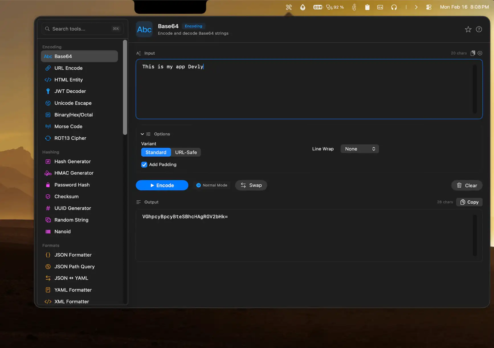 Macty keeps everyday tasks tight and local, from formatting JSON or decoding JWTs to generating tokens, cleaning URLs, and creating polished visuals. Lightweight, offline, and surprisingly complete.