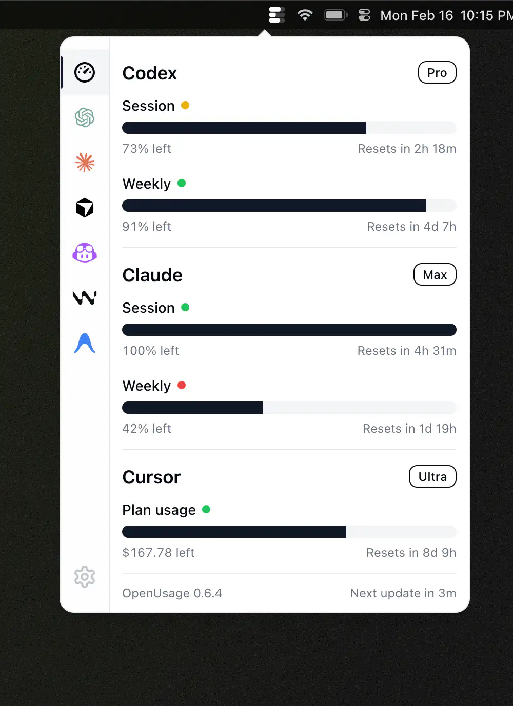 OpenUsage keeps track of your AI coding limits across providers like Codex, Claude, and Cursor, so you always know what’s left before a reset hits. It’s plugin-based, and quietly updates in the background, giving you one clear overview instead of ten scattered dashboards.