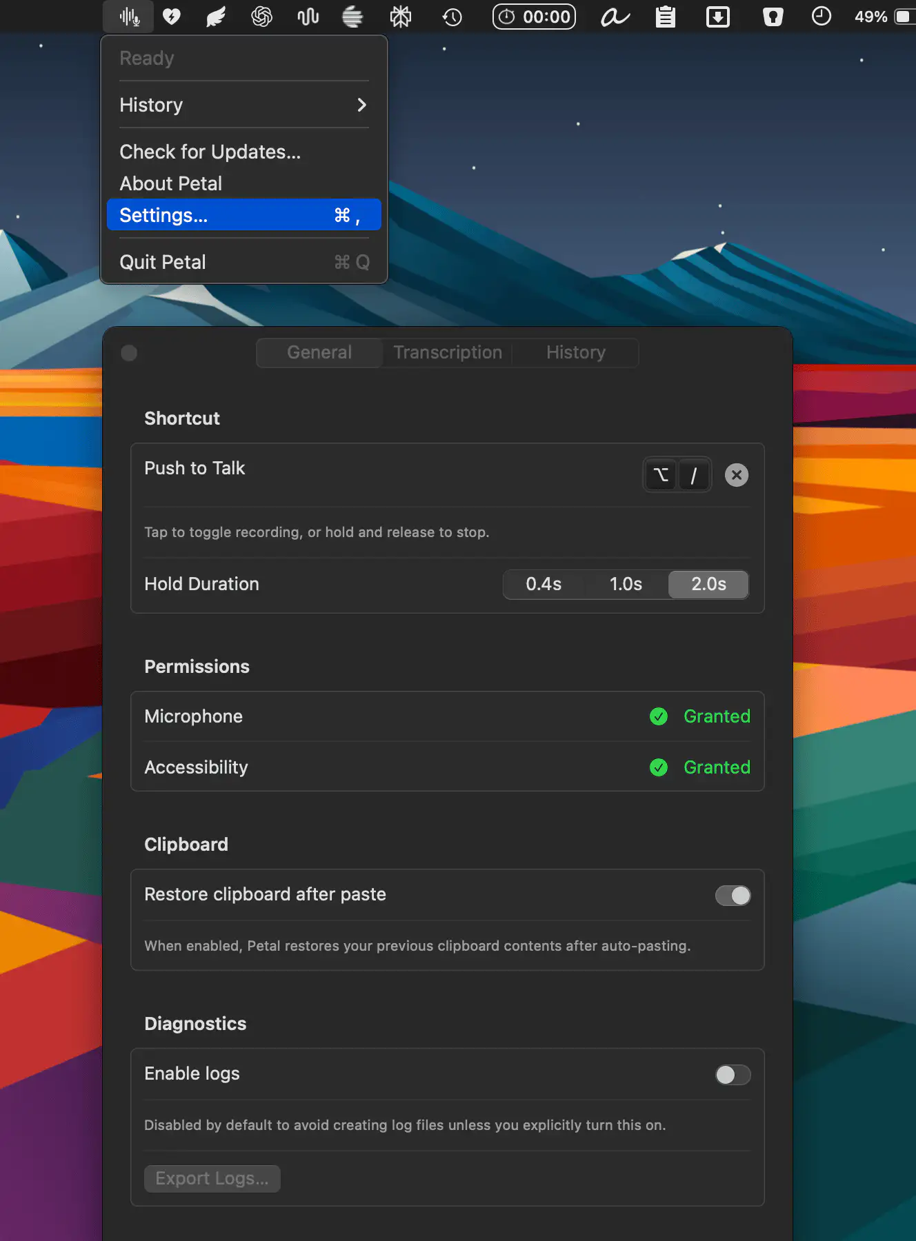Petal is a dictation app that runs entirely on-device, supporting Qwen3 ASR and Voxtral alongside Whisper. With a simple push-to-talk workflow and optional Smart Mode that cleans up filler words into polished prose, it keeps everything local, transparent, and subscription-free.
