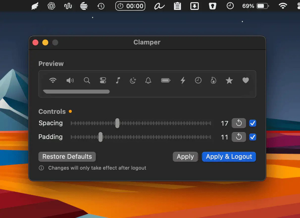 Clamper gives you precise control over the spacing and padding of your macOS menu bar icons, complete with real-time preview and subtle haptic feedback. A single click restores everything to default.
