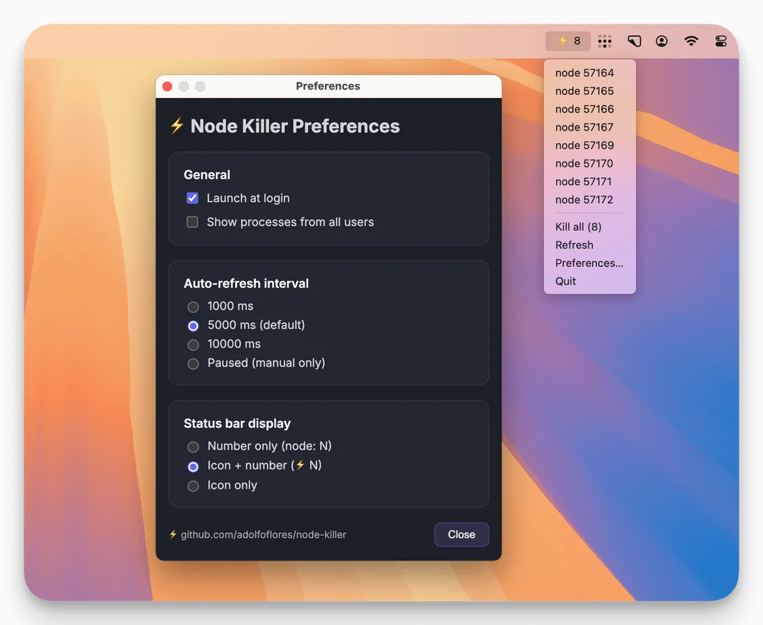 Quickly monitor and kill stray Node.js processes from your Mac menu bar. Node Killer shows active processes and lets you clean them up with a single click. Simple, fast, and native.